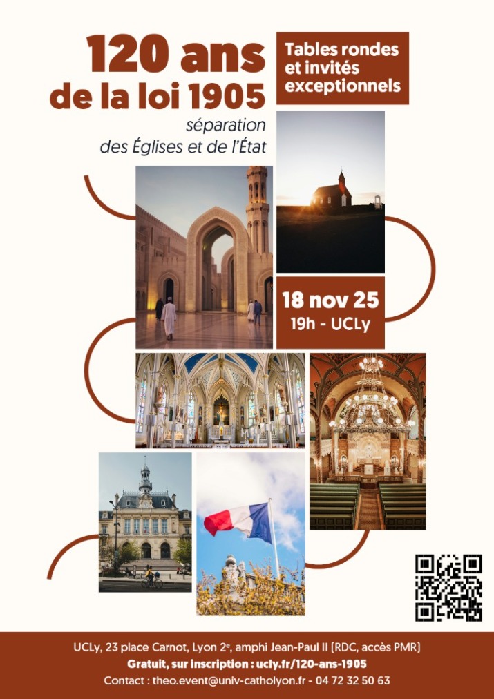 Le 18 novembre, nous vous invitons à une soirée unique, pour célébrer les 120 ans de la loi 1905 (séparation des Églises et de l’État). Deux tables rondes, avec des professeures de droit et des représentants des cultes à Lyon :