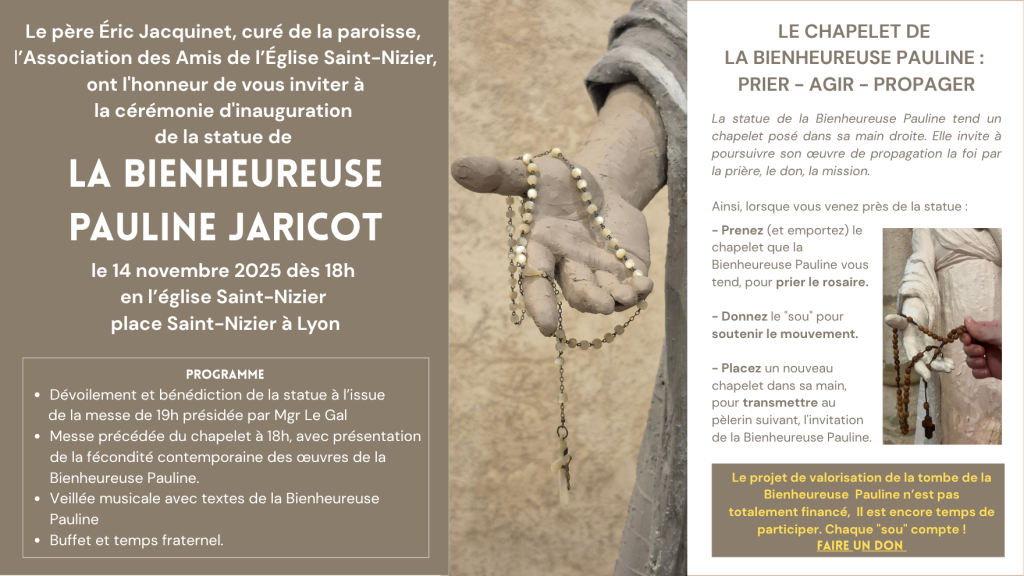 La bénédiction de la statue aura lieu le 14 novembre 2025 à 20 h, à l’issus de la messe à l’église Saint-Nizier (Lyon 2).
