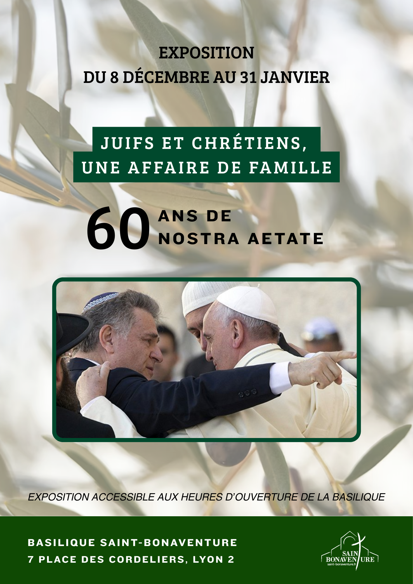Du 8 décembre au 31 janvier, vous pouvez retrouver à la Basilique Saint Bonaventure l’exposition Du 8 décembre au 31 janvier, vous pouvez retrouver à la Basilique Saint Bonaventure l’exposition «Juifs et Chrétiens, une affaire de famille», aux horaires d’ouverture de la Basilique.