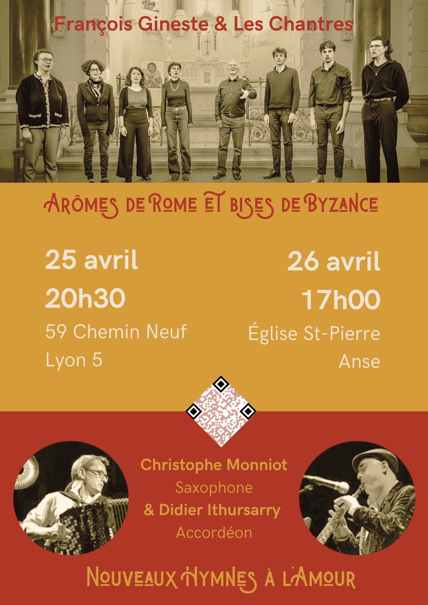 1/ “Arômes de Rome et bises de Byzance” : Chants des traditions romaines et byzantines sur des compositions de François Gineste, chantre byzantin, qui dirige l’ensemble “Les Chantres”