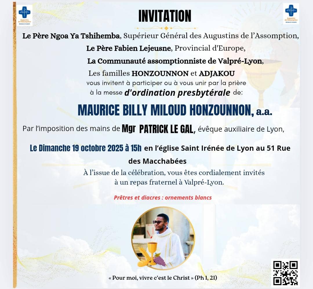 Ordination presbytérale présidée par Mgr Patrick Le Gal en présence du père Ngoa Ya Tshihemba, Supérieur général des Augustins de l’Assomption, du père Fabien Lejeusne, Provincial d’Europe et de la communauté assomptionniste de Valpré-Lyon. A l’issue de la célébration, réception à Valpré.