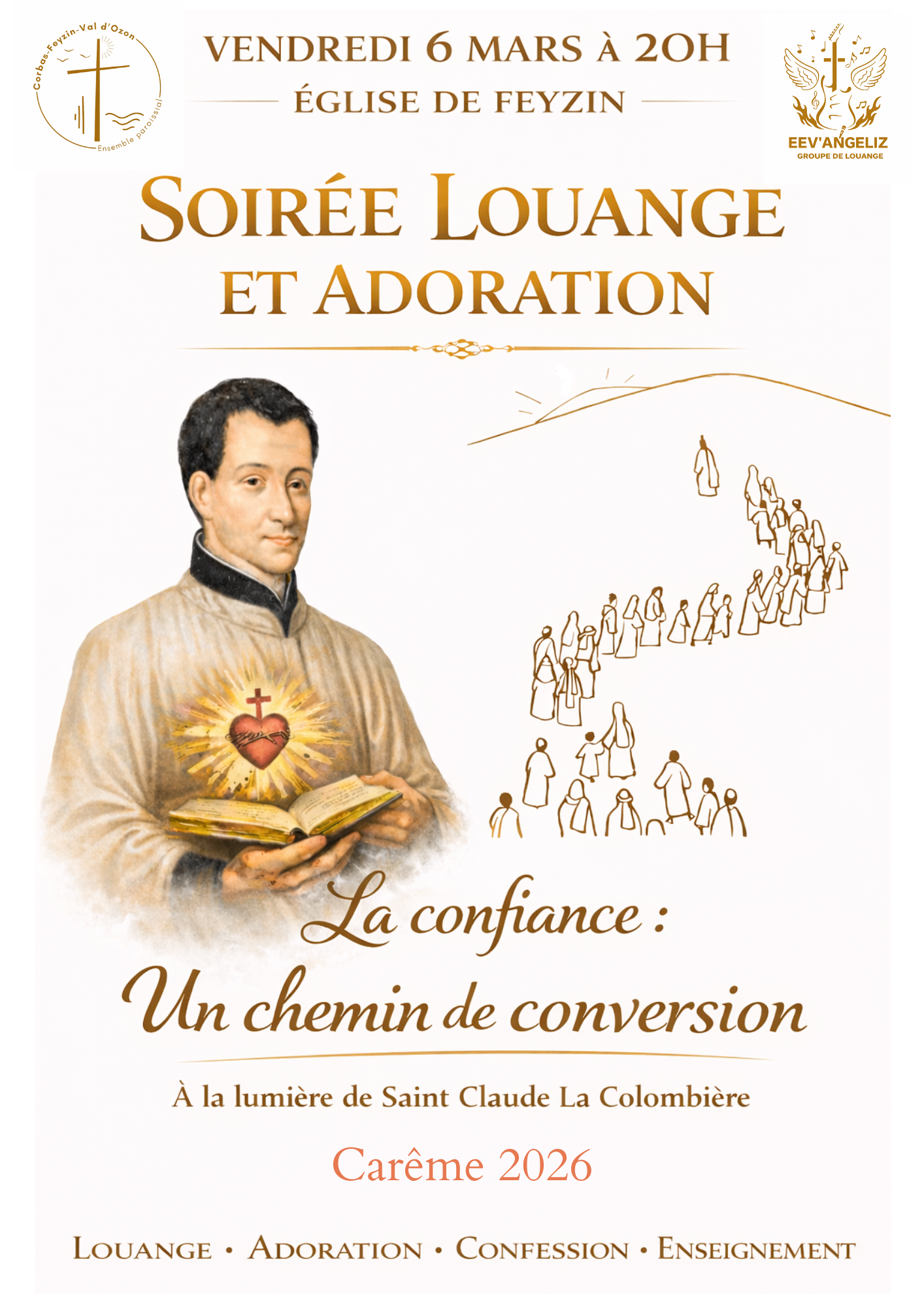 Soirée spéciale carême sur le thème :” la confiance, un chemin de conversion” à la lumière de St Claude la Colombière et de son acte de confiance. A travers la louange, un enseignement, la confession et l’adoration, nous apprendrons à nous abandonner davantage au Seigneur. Une soirée pour déposer nos fardeaux et laisser Dieu transformer nos cœurs. Venez nombreux!