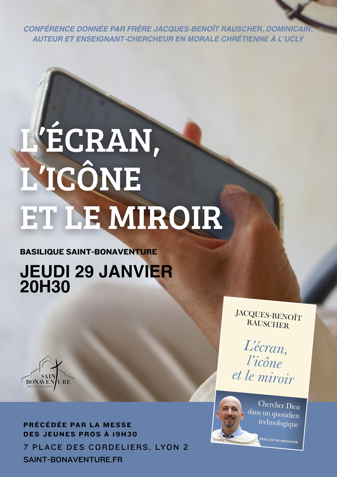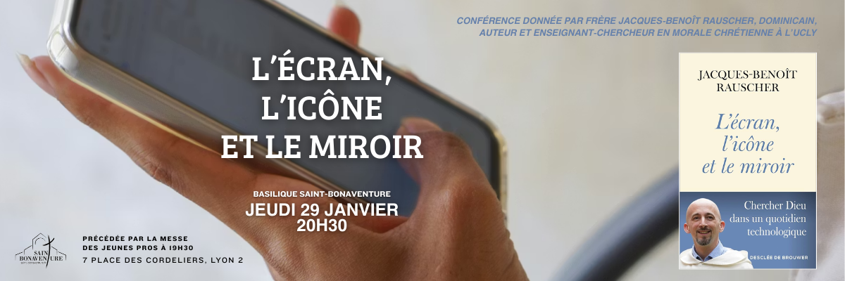 Le Frère Jacques-BenoÎt Rauscher, DOMINICAIN, auteur et Enseignant-chercheur en morale chrétienne à l’UCLY, tiendra une conférence basé sur son livre «L’écran, l’icône et le miroir.» dans lequel il questionne l’évolution des comportements, des habitudes et des pratiques religieuses de chacun dans cette époque remplie de nouvelles technologies.