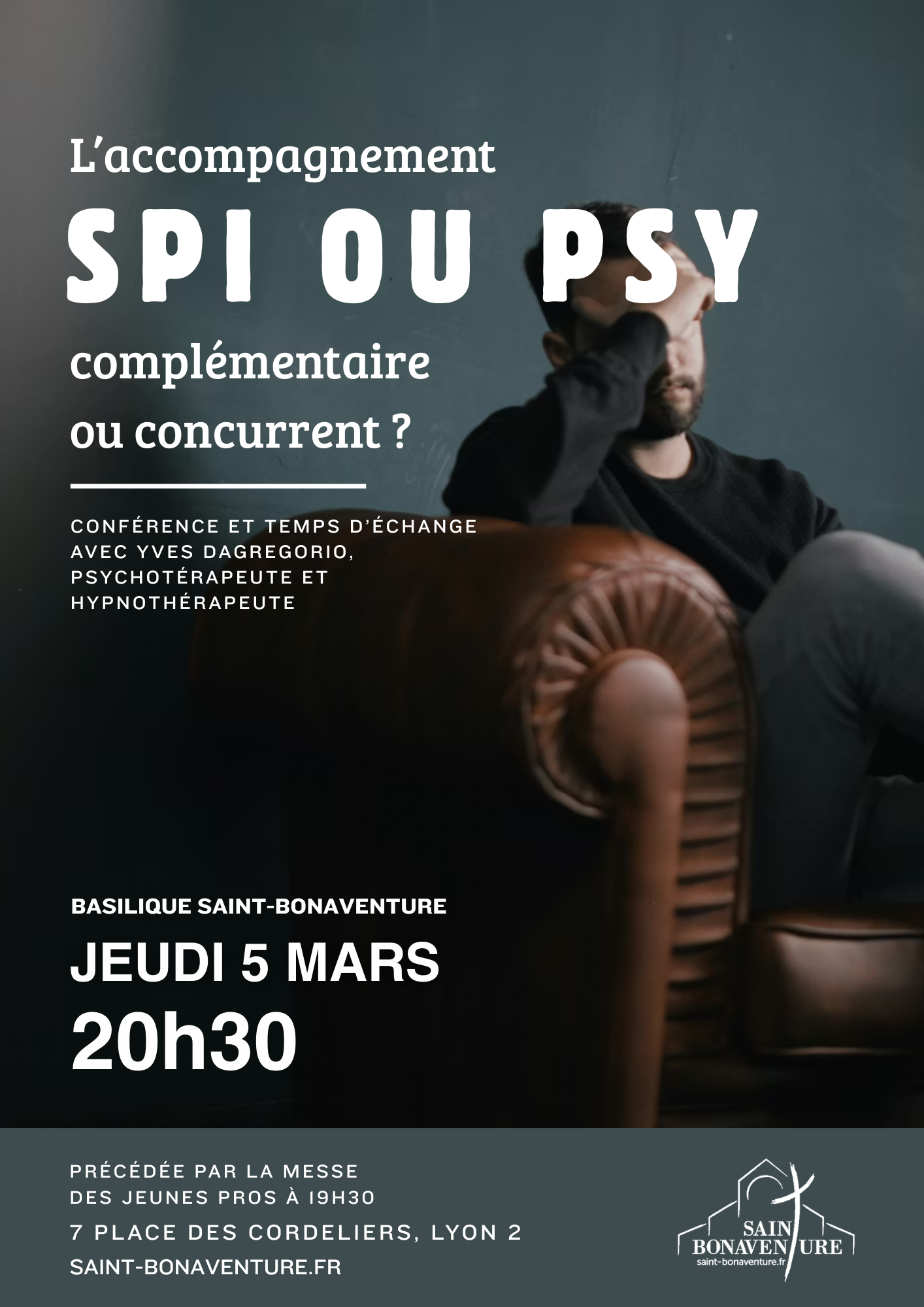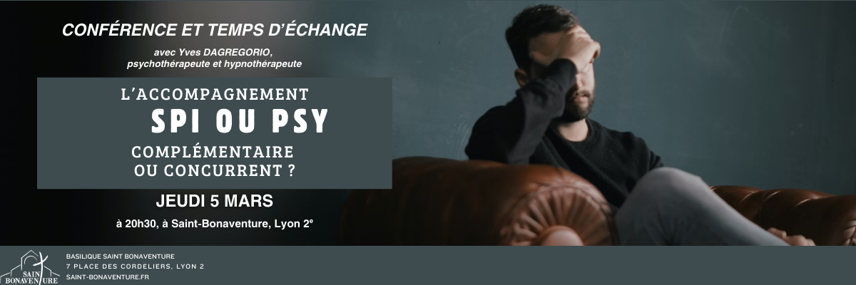 À la suite de la messe des jeunes professionnels le 5 mars, une conférence suivie d’un temps d’échange organisés par Yves Dagregorio, psychothérapeute et hypnothérapeute, aura lieu. Ce moment portera sur l’accompagnement dont vous pouvez avoir besoin en cas de moments de faiblesse et de savoir ce que l’accompagnement spirituel et l’accompagnement psychologique peuvent chacun apporter.